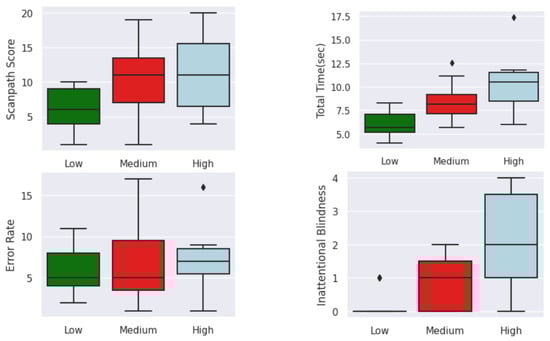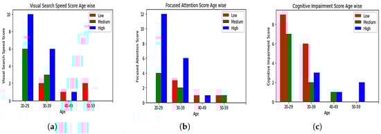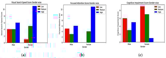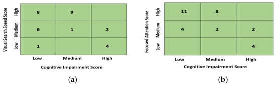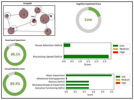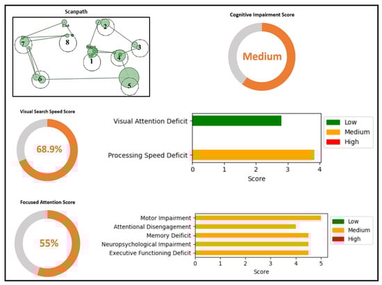 The specific score in visual search speed of a participant can lead to inferring the exact deficit of the participant. The TMT follows a visually guided task where the participants need to visually attend each AOI in a specific order []. The visual search pattern of an individual may differ from that of others []. The visual-search-speed score indicates the efficiency in visual search and speed of completion. The gaze patterns of an individual are the indicators of their visual behavior [,]. An individual’s cognitive state and activities can be discovered based on their visual behavior [].