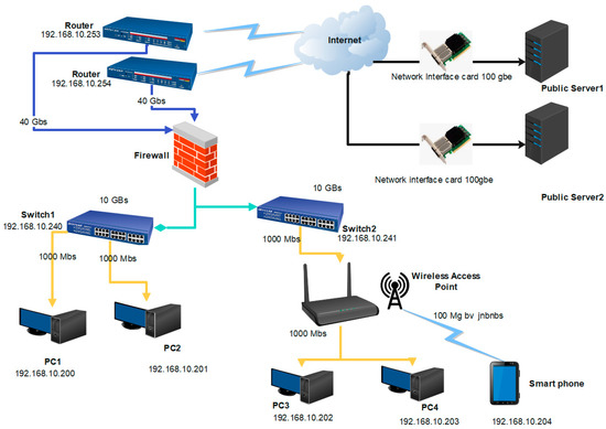 An accuracy evaluation of a network depends on various factors that require different assessment options, such as knowledge of the network, scalability, minimum packet drop and receive ratio, and authentication of the source and destination, as well as fault and error analyses [41]. Mainly, these evaluations are categorized into processes, impact, outcomes, and result. Traffic monitoring, also known as network monitoring, involves the processing and analyzing of the incoming and outgoing network data using particular hardware and/or software [42]. At the basic level, different types of tools are used to monitor the network, and various parameters are checked, including information on the packet size, type of traffic (voice/I.P., control traffic, and web traffic, etc.), traffic source, and packet processing speed. During this monitoring, the data uploaded and downloaded should be displayed to the network administrator to necessitate advanced reporting. Resource sharing refers to the sharing of library resources by specific participating libraries based on cooperation. Resource sharing means making one library’s collections available to consumers. Resource sharing contains technical capabilities, end-to-end time, stability of the required resources, expertise in traffic congestion handling, and the policies of routing and switching vital to obtaining that aim.