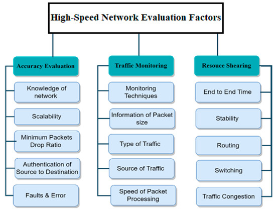 Accuracy and speed are valuable parameters for intrusion detection and prevention systems in high-speed networks. As numerous attacks continue to emerge, accurately monitoring vulnerability using regular expression is not straightforward [40]. The taxonomy of high-speed network evaluation factors is shown in Figure 3. The proposed taxonomy is categorically divided into accuracy evaluation, traffic monitoring, and resource sharing.