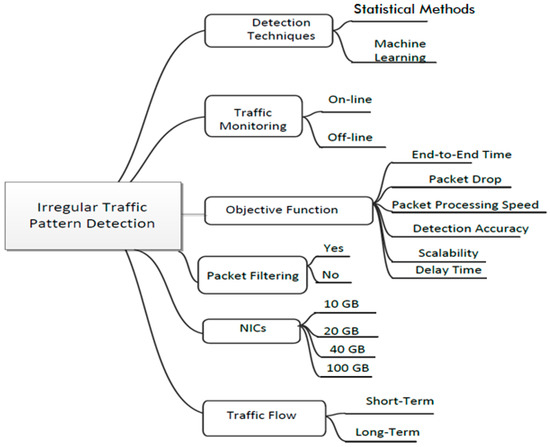 A low-rate DDoS attack detection method (LDDM) using a multidimensional sketch structure and network flow measuring allows for a reduction in the data storage cast and improves the detection accuracy [65]. The measurements depend on the daubechies four wavelets transform to calculate each sketch’s energy percentage. This approach differentiates between the regular and attack traffic. The LDDM is used to evaluate low-rate DDoS attack datasets, but a high-rate DDoS attack is not considered. Figure 6 shows different irregular traffic pattern detection.