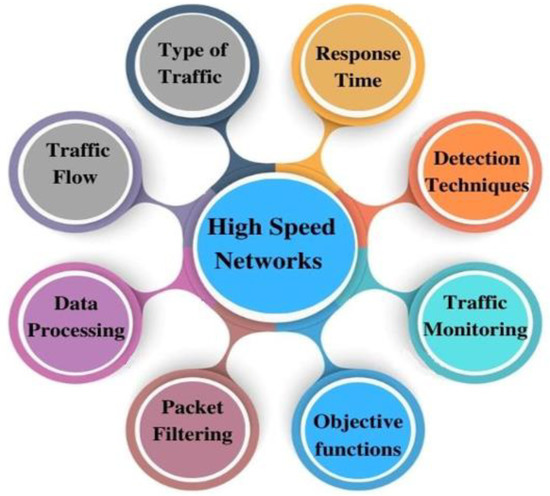 The development of network speed can be traced back to the 1960s, when the first computer networks were created. These networks allowed numerous computers to share resources, such as printers and data. Ethernet technology was invented in the 1980s, allowing computers to communicate at speeds of up to 10 Mbps [19]. This was followed in the 1990s by the creation of Fast Ethernet, which boosted this speed to 100 Mbps [20]. Gigabit Ethernet was created in the early 2000s, allowing for up to 1 Gbps rates. This was followed by 10 Gigabit Ethernet, which offers up to 10 Gbps rates [21]. Fast data transfer rates with a low latency, high bandwidth, and reliable and consistent performance are called high-speed networks (HSN). HSN technologies are being developed to enable even quicker and more efficient communication between devices. Among these technologies are 40 Gigabit Ethernet, 100 Gigabit Ethernet, and InfiniBand [22]. A Cisco Report predicted that the internet protocol may cross 4.3 zettabytes in 2023, which is 1879 exabytes higher than 2018 [3]. The variety of devices connected to the internet leads to massive data transfer on the network with a high velocity, which fulfils the critical demand of big data [18]. Smart devices face many security threats due to their internet connectivity and the various applications running on high-speed networks [23]. A high-speed communication network has a high bandwidth and low-latency communication. A data stream analysis is necessary for high-speed real-time data from many resources connected to the network [24]. According to [25], packet speed categories can be classified as shown in Table 1, while Table 2 shows the traffic types with their characteristics.