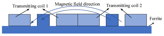 In this design, the length L2 of the receiving coil of the UAV is selected as 120 mm and all coils are made of copper wire. In order to ensure that the size of the transmitting coil can meet the influence of the offset of the UAV, the length of the transmitting coil needs to be slightly larger than the length of the receiving coil of the UAV. The transmitting coil length L1 is set to be 140 mm. Considering that the UAV will be affected by the offset factor when it lands, and considering the position factor of the second rack of the UAV, it is determined that the total width W1 of the UAV’s transmitting coil is 90 mm.