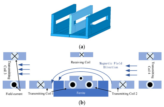Diagram of the new orthogonal coupling device. (a) A new orthogonal coupler model. (b) Schematic diagram of magnetic field transmission of new orthogonal coupling device.