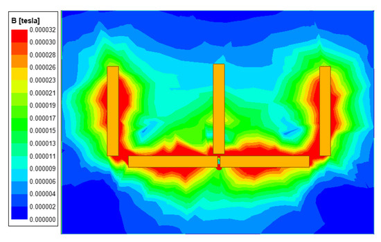 The magnetic flux leakage of the system is an important aspect to be considered in the design of the wireless charging system. Ansys Maxwell finite element simulation tool is used to construct the simulation model of the coupling device. The cross-sectional magnetic field distribution is shown in Figure 6. The orange boxes indicates the magnetic field strength. The receiving coil is surrounded by a green uniform magnetic field. It can be found that the transmitting magnetic field is distributed near the transmitting platform, and the receiving coil can capture the transmitting magnetic flux well.