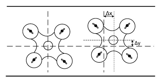 The actual scene when the UAV is docked is shown in Figure 7. The UAV on the left shows that the UAV is facing the charging coil, and the right side is a schematic diagram of the UAV’s charging offset, where Δx and Δy are, respectively, offset when docked.
