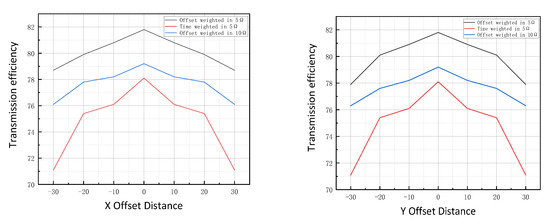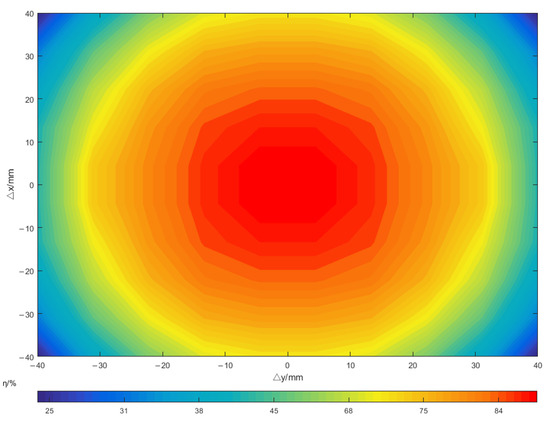 In the analysis of the size of small drones on the market, the offset range is limited to 60 mm, considering the offsets in the X and Y directions, namely ±30 mm. Figure 8 is the corresponding relationship between the two-dimensional normal distribution obtained in the simulation and the efficiency change of the primary and secondary coils when the horizontal and vertical offsets occur.