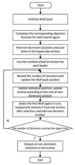 The gray wolf algorithm with good optimization ability is used to solve the above optimization problem [20]. The process is shown in Figure 9. According to the experiment, when the number of iterations is 200, the Pareto surface can reach convergence. Therefore, the number of iterations is set to 200, the size of the wolf pack is set to 100; the control parameter is a = 0.1; the swing factor A = 10, C = 2; and the roulette coefficient is set to 2.