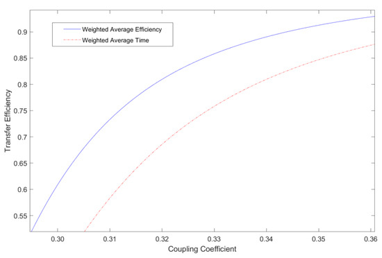 To further illustrate the feasibility of this method, this time, it will be compared with the time-weighted coefficient method. The time-weighted coefficient method is based on the different characteristics of the battery considered in different charging stages, and assigns weights to the efficiency values of different stages of battery constant current and constant voltage charging to obtain the optimal time-weighted average efficiency [21]. The efficiency curve obtained by using the time-weighted coefficient method after the coupling coefficient is shifted within [0.35, 0.31] and is shown in Figure 10.