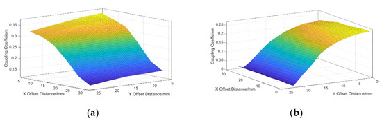 As can be seen from Figure 12, the test results show that when the rotation angle is 20° and the deviation is 25 mm along the X-axis, the coupling coefficient of the new orthogonal coupling device increases by 0.11 compared with that of the bipolar device. When the rotation angle is 20° and the Y-axis is offset by 20 mm, the coupling coefficient of the new orthogonal coupling device is increased by 0.15 compared with that of the bipolar device. which indicates that the new orthogonal coupling device has better anti-deviation ability.