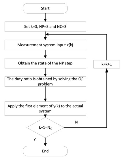 The optimal duty ratio control signal at the current moment can be obtained . To cope with the interference brought by various external environments and device parameter changes to the system, the process will be executed in each sampling period in a rolling optimization manner. If the rated power output needs to be achieved, it can be achieved by changing the current reference value. The constant current control method program based on model prediction is written on the MATLAB platform, and the algorithm flow is shown in Figure 14.