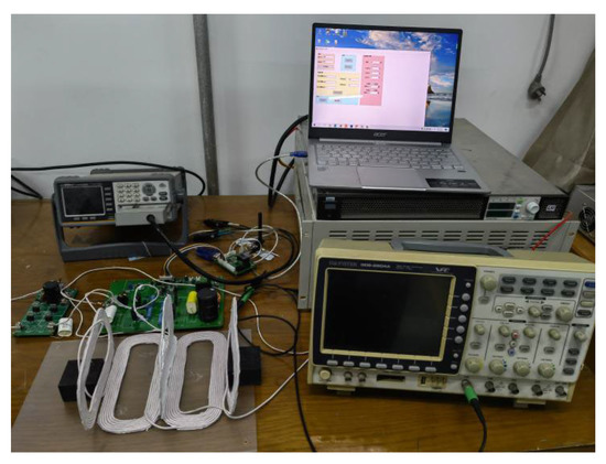 In this experiment, the coil of the coupling device is wound with a high-frequency Litz wire with a diameter of 3.5 mm. The operating frequency of the system is set at 85 kHz. After measuring the actual weight of the receiving coil after winding, the weight of the coil is 47 g, accounting for only about 9% of the weight of the UAV. It can be seen that the coupling mechanism has little effect on the weight of the UAV and can be conveniently installed on the drone. The system is composed of a DC power supply, a high-frequency inverter, a rectifier filter unit, and an electronic load, as shown in Figure 18.