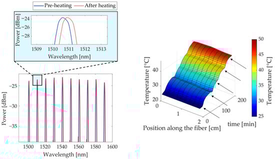 A fiber optic temperature probe was introduced into the kidney tissue to monitor the spatial variations of the temperature of the sample during heating. The reflection spectra showing the 10 peak Bragg reflections before and after heating are shown on the left. On the right, a representative thermal map across the tissue depth and time is depicted. The graph refers to an experimental trial on porcine kidney tissue and shows the thermal values from room up to hyperthermic temperatures. The arrows indicate when the measurement of the thermal properties was performed, i.e., in steady-state heat transfer conditions when the tissue sample reached thermal equilibrium.