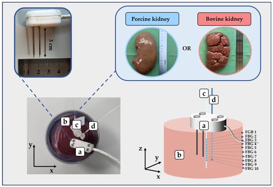 The tissue sample was located in the metallic container with a silicone lid. Then, the probes were inserted into the sample and kept in place during the measurement of thermal properties. On the left, the picture of the metallic container is reported, showing (a) the dual-needle SH-3 probe, with a focus on the two needles (3 cm in length) used for the measurements; (b) the tissue samples, i.e., either ex vivo porcine or bovine kidney tissue; (c) the optical-fiber-based temperature probe; and (d) the k-type thermocouple. On the right, the three-dimensional schematic representation of (a) the dual-needle probe, (b) the kidney tissue sample, (c) the optical-fiber-based temperature probe embedding an array of 10 fiber Bragg grating (FBG) sensors, and (d) the k-type thermocouple is shown.