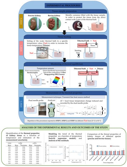 All the experiments were conducted in porcine and bovine kidney samples obtained from a local butcher, i.e., six porcine and six bovine specimens. The tissues were freshly excised, refrigerated, and then allowed to reach room temperature before proceeding with the experiments. The experiments were performed with the aim of preserving the structure of the kidneys and penetrating both the cortex and medulla with the dual-needle probe [38]. A metallic container was covered with a silicone lid avoiding air bubbles that may affect measurements. The used lid was drilled with four holes, with the aim of inserting the SH-3 dual-needle sensor used to measure the thermal properties of the tissue. Additionally, thermometers were used to monitor tissue temperature during the heating procedure, i.e., one thermocouple and a fiber-optic-based temperature probe (Figure 3). The thermocouple and fiber optic probe were inserted into the tissue using needles, which were placed close to the SH-3 sensor. Indeed, the TEMPOS system constituted by the SH-3 probe and the thermal analyzer is itself capable of resolving temperature to ±0.001 °C. The decision to employ two additional temperature sensors close to the SH-3 dual-needle probe was made to ensure the absence of thermal gradients in the region of the tissue close to the dual-needle probe during the measurement of thermal properties. It has been proved that a minimum of 4 mm of material must be parallel to the dual-needle probe in all directions to guarantee accurate measurements [8]. Hence, we wanted to verify the steady-state heat transfer conditions during measurements of k and α, especially in the volume of tissue closely surrounding the SH-3 sensor. The position of all the probes inserted in the tissue was kept still using strips of parafilm and tape to avoid displacement of the sensors during measurements. An additional thermocouple was inserted into the water of the thermal bath. Figure 4 reports the flowchart outlining the experimental procedures and analysis performed in the present study.