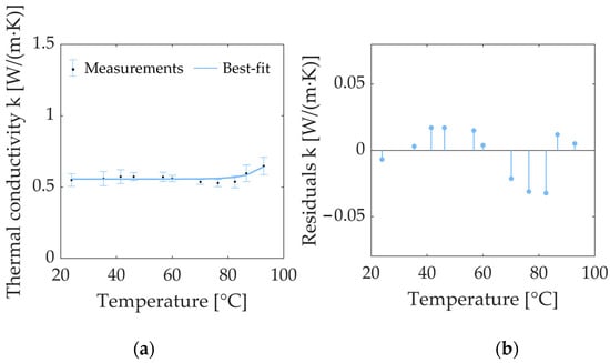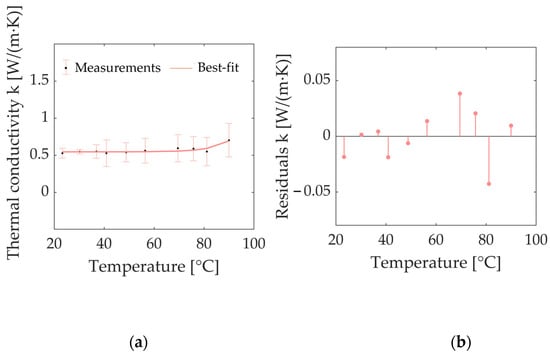 Figure 5a also depicts the best-fit model for the accurate approximation of the trend of the experimentally investigated k values, which are represented by an exponential curve defined using Equation (6). The regression coefficients are reported in Table 2, along with the R2. The results of the residuals analysis are reported in Figure 5b. The residuals appear distributed around the y = 0 value, and their values at different temperatures are <7% of the measured property values. The best-fit curve slightly underestimates the values in the range between 35.4 °C and 60.0 °C, while it overestimates them in the 70.1–82.3 °C range. Lastly, a slight underestimation is notable at temperatures higher than 82.3 °C.