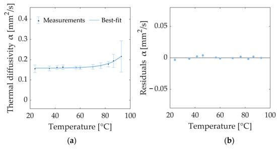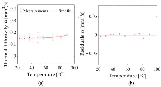 Concerning the measurement of α at different temperatures, α remained almost constant from room temperature up to 60.0 °C, showing values in the interval of 23.9–60 °C, ranging from a minimum of 0.155 mm2/s (observed at 23.9 °C) to a maximum of 0.163 mm2/s (at 46.2 °C). After 60.0 °C, the value α increased with temperature, reaching values of 0.178 mm2/s at 82.3 °C, 0.194 mm2/s at 86.6 °C, and 0.216 mm2/s at 92.8 °C, corresponding to increases, compared to the baseline values, of 14%, 25%, and 39%, respectively. Figure 6 shows the values of α at the different temperatures along with the best-fit curve interpolating the experimental measurements. The trend of α as a function of tissue temperature was modeled using an exponential curve (Equation (6)), whose regression coefficients are reported in Table 2. Regarding the analysis of the residuals, the residual plot is depicted in Figure 6b. The residuals are distributed around the value y = 0, and their values are lower than 3% of the property values. According to the residual plot, the chosen exponential model slightly overestimates the values in the 23.9–35.4 °C thermal range and at 82.3 °C, whilst it slightly underestimates the values at 41.5–46.2 °C, 76.4 °C, and 86.6 °C.