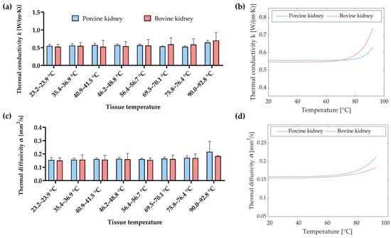 Comparison of the thermal properties of porcine and bovine kidney tissues: (a) Bar plot reporting the average values of k attained at temperatures of 23.2–23.9 °C, 35.4–36.9 °C, 40.9–41.5 °C, 46.2–48.8 °C, 56.4–56.7 °C, 69.5–70.1 °C, 75.8–76.4 °C, and 90.0–92.8 °C for both porcine and bovine samples, along with the associated measurement uncertainty (estimated with a 95% confidence level). (b) Best-fit regression curves interpolating the experimental k data for both porcine and bovine kidney samples. (c) Bar plot reporting the average values of α obtained for both porcine and bovine samples at the different selected temperatures, along with the associated measurement uncertainty (a 95% confidence level). (d) Exponential curves obtained using the best-fit curve of the measured values of α for both porcine and kidney tissues.