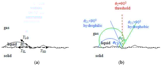 (a) A liquid droplet on a conductive polymer layer with roughness, with an illustration of the contact angle; (b) evolution of the contact angle from hydrophilic to hydrophobic near the threshold region (θC threshold = 90°).