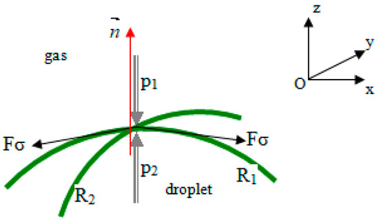 where p1 and p2 are the pressures exerted on the interface by the gas above and by the liquid below, respectively; σ is the surface tension coefficient; and R1 and R2 are the droplet surface curvatures as measured by two radii in orthogonal directions (Figure 2).