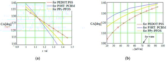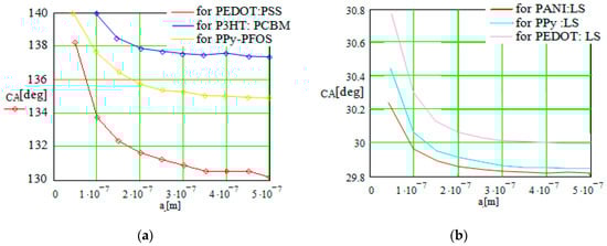 First, the method was applied to study the CA dependence on different parameters like the roughness degree of the conductive polymer layer, the droplet radius, or the surface tension of the fluid. A few sets of results for the hydrophobic and hydrophilic CPs with dopants are illustrated in Figure 3. The hydrophobic CP variants were PEDOT:PSS; P3HT:PCBM; and PPy–PFOS. The hydrophilic variants were PANI:LS; PPy:LS; and PEDOT:LS.