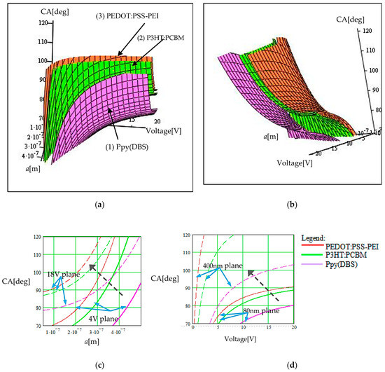 Double-parametrical graphs of the CA when the wettability character changes from hydrophobic to hydrophilic and vice versa, in the function of the applied electric voltage, considering a second variation of a previously specified internal parameter, are illustrated in Figure 5, Figure 6 and Figure 7. We considered, for exemplification, the cases of the following three types of doped CPs: Ppy(DBS) (denoted as CP(1)) (as reference material for verifying the method) [14,19], P3HT:PCBM (denoted as CP(2)), and PEDOT:PSS–PEI (denoted as CP(3)).