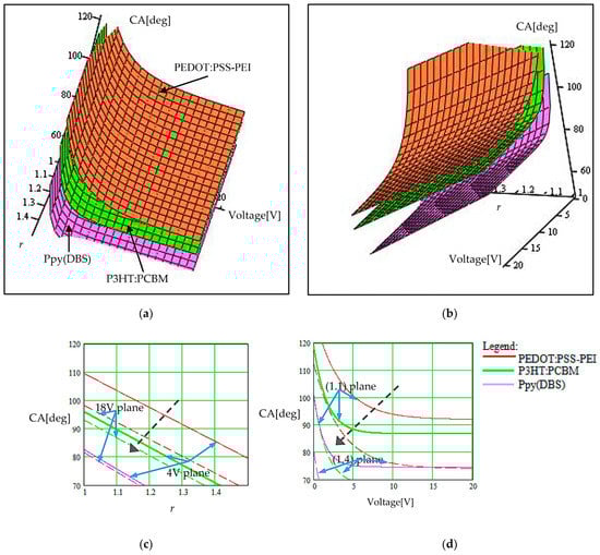 The same decomposition strategy for the 3D graphs was applied in the case of the double-parametrical representations of the contact angle given in Figure 6 and Figure 7. In Figure 6, we represent the dependence of the contact angle on the roughness degree of the CP layer, r, when the applied voltage for commuting the polymer wettability was varied. Cross-sections of the 3D graph are available in Figure 6c,d for the cases of constant voltage and constant roughness degree, respectively. The cross-section plane was moved in two positions in each case, for a lower and higher value of the constant parameter. The obtained curves are indicated on the two 2D graphs (two sets of curves, continuous and dashed curves, respectively). Each set corresponds again to the three considered polymers (Ppy(DBS), P3HT:PCBM, and PEDOT:PSS–PEI).