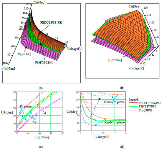 Figure 7 illustrates the contact angle dependence on the surface tension of the fluid, γ, when a voltage in the interval (0–20 V) was applied to change the polymer wettability from hydrophobic to hydrophilic and vice versa. The 3D graph was rotated in two positions (like in Figure 5 and Figure 6 presented above) for visibility, in Figure 7a,b. The cross-sections of the 3D graph are represented for two constant voltage planes (Figure 7c) and for two constant γ planes (Figure 7d). The planes corresponding to the constant voltage migrate in the right-down direction when the voltage increases, and to obtain the same value for the CA, the surface tension of the fluid has to be increased. The planes corresponding to constant γ migrate to the right-up direction when γ increases, and to obtain the same value for the CA, the applied voltage also has to be increased. In each set of curves represented for a constant parameter, the three curves corresponding to the three analyzed polymers can be identified, like in Figure 5 and Figure 6 presented above.