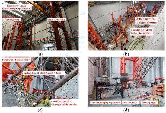 Considering the primary arch ring segmentation, the external concrete was cast in 18 stages. Considering the erection of the rigid steel skeleton, the pouring of inner tube concrete, and the application of the permanent load balance weight, the primary arch ring was divided into 40 construction phases, as illustrated in Table 1. Figure 4 shows pictures of some key construction nodes of the primary arch ring of the model bridge.