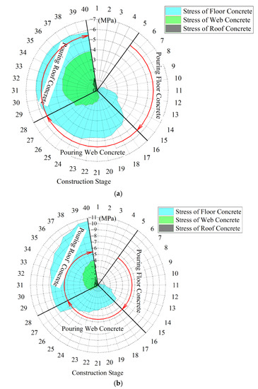 - Due to the negative bending moment at the arch crown, casting concrete near the mid-span can significantly reduce the compressive stress level of the floor concrete. When casting the mid-span closure section web and roof concrete, the floor concrete compressive stress, respectively, decreases by 1.46 MPa and 0.89 MPa, with a decrease of 18.02% and 9.36%.