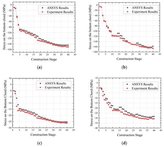 To validate the correctness of the finite element model, we have compared the stress results measured and simulated in the rigid steel skeleton, the concrete inside the tubes, and the externally wrapped concrete at some key cross-sections during various construction stages. These comparisons are graphically presented in Figure 15.