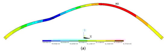 The rigid steel frame of the main arch ring is made of Q420 steel. An ideal elastic–plastic model is used and simulated using the bilinear kinematic hardening model (BKIN) in the finite element model. As shown in Figure 17a, the relationship between and can be expressed using Equation (4):