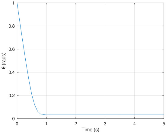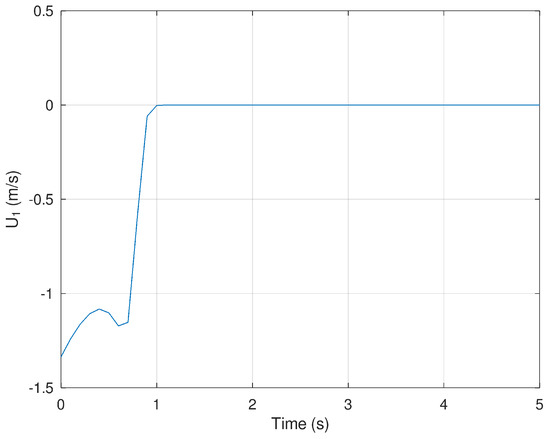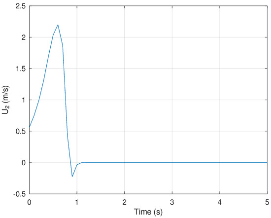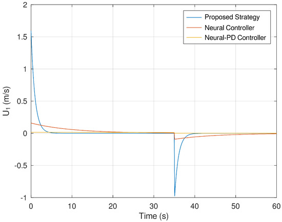 Finally, Figure 14 and Figure 15 show the evolution in time of the control efforts for the variables and . It is important to notice that the control effort for both control inputs is significantly smaller in comparison with the control effort generated by the neural and neural PD control strategies. This is an advantage when the controller is implemented in a real experimental setup. If the control effort is smaller, then unwanted effects like saturation are avoided.