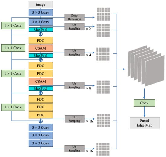 Proposed architecture. The backbone network is inspired by Xception, where the depth-wise separable convolution layers are replaced with regular convolutions and fusion difference convolution (FDC). The network incorporates the channel spatial attention module. The output of each main block is fed back to the upsampling block to generate intermediate edge maps, which are further combined to produce the fused edge map. More details are given in Section 3.