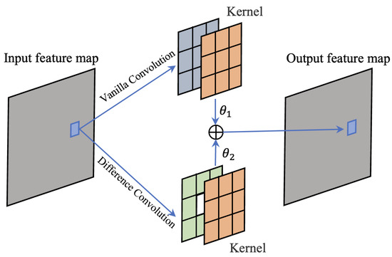 To address the aforementioned issues, we introduced vanilla convolution into the difference convolution structure, controlled by hyperparameters and , both ranging from 0 to 1. These two convolutions share learnable weights. When and , the structure degenerates into vanilla convolution, while and results in the PDC structure. This design allows us to tackle the two problems mentioned earlier. When a pixel is a noise point in the image, the addition of vanilla convolution enables us to learn meaningful image information. On the other hand, by relying on vanilla convolution, we can obtain the desired image semantic information even in the shallow layers of the network. The specific architecture can be seen in Figure 5.