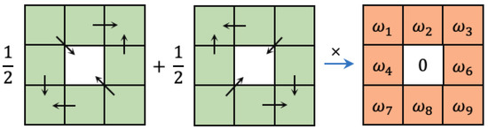 In addition, following the approach of [19], we transformed the aforementioned four fusion difference convolutions into vanilla convolutions. This transformation significantly reduces the computational cost and memory footprint, allowing our model to perform inference operations with almost the same computational complexity as the original vanilla convolution structure. Taking one of the fusion difference convolution structures depicted in Figure 7 as an example, we applied the following equation for the conversion: