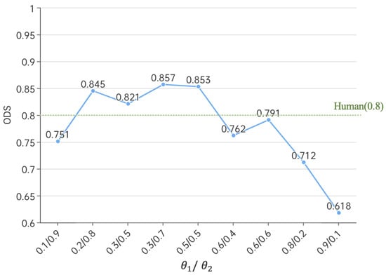 Line chart of super parameter , and ODS. The X-axis represents hyperparameters and , and the Y-axis represents the output image ODS value. It can be seen that when and , the model reaches its optimal state.