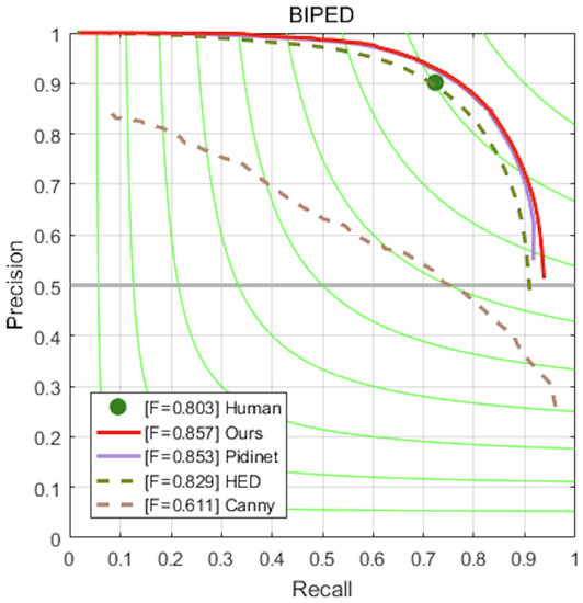 Precision–recall curves of our models and some competitors on BIPED dataset.