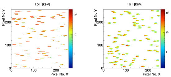 - Bergmann, B.; Burian, P.; Manek, P.; Pospisil, S. 3D reconstruction of particle tracks in a 2 mm thick CdTe hybrid pixel detector. Eur. Phys. J. C 2019, 79, 165. [Google Scholar] [CrossRef]
