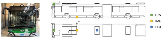 This section aims at introducing the experimental setup used for the validation of both the Kalman filter and the Traffic Light Advisor system. The localization algorithm relies on a GPS receiver, responsible for locating the vehicle via latitude and longitude measurements, the integrated speed value available from the Electronic Control Unit (ECU) of the trolley-bus, and an Inertial Measurement Unit (IMU) that returns the values of acceleration along its axes. The main navigation system utilized is the GPS which is installed on the front part of the vehicle and provides spatial coordinates in a fixed reference frame. As mentioned, it can be missing for significant portions of the path when the number of satellites is not sufficient or the signal is not reliable, thus not allowing the algorithm to know the measurement of the vehicle’s position. The information coming from the GPS receiver must be then fused with other measurements coming from the ECU, providing the longitudinal velocity of the vehicle, and the 5 DoF IMUs measuring the acceleration of a body along the three main axes (x, y, z), as well as the rotational speed around the x and y axes as shown in Figure 1.