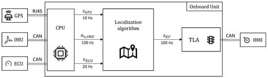 It is worth mentioning that, as depicted in the architectural diagram in Figure 2, the available sensors have different sampling frequencies. In fact, the GPS rate is 10 Hz, while the ECU returns the speed value at 20 Hz and the acceleration from the IMU comes at 100 Hz. As a consequence, the localization algorithm running at 100 Hz has to deal with these different frequencies.