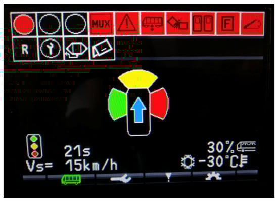 On the onboard computational unit, the sensor acquisition, the localization algorithm, as well as the TLA system run on a soft real-time-based Robotic Operating System (ROS) architecture [32], allowing to have a simple framework for managing information coming from different sources using a publisher–subscriber logic. Within this framework, there are different nodes for publishing both the raw sensor data on the vehicle network and the vehicle data that can be read from its Controller Area Network (CAN), such as vehicle speed. This connection to the vehicle CAN-bus is used also to publish the outputs of the Traffic Light Advisor system so that the information can be shown to the driver on the integrated dashboard of the vehicle. Figure 3 reports a sample snapshot of the dedicated Human–Machine Interface (HMI). In particular, in the middle of the dashboard the driver receives a synthetic visual indication (i.e., an arrow indicator) to understand whether to accelerate or decelerate with respect to the current vehicle speed in order to reach the traffic light without stopping. This is done in order to minimize as much as possible the possible distraction source for the driver. However, additional information, such as the current traffic light status (i.e., top left corner), the time-to-change of the upcoming traffic light, and the value of the speed proposed by the TLA algorithm (i.e., bottom left corner), is provided in the periphery of the HMI.