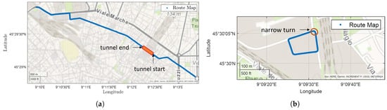 The testing area is available on a 4 km long portion of the regular service trolley-bus path in the city of Milan, being mainly covered in a preferential lane for public transportation. The route map (see Figure 4a) includes different scenarios, such as avenues with trees, urban canyoning, mid-narrow turns, and a tunnel 200 m long where the GPS is missing for a relatively long time. Furthermore, in order to have a better assessment of the localization algorithm, additional tests have been performed where a more favorable RTK correction for GPS is available, thus having a ground truth reference to evaluate the algorithm’s performances. Moreover, the second testing scenario (see Figure 4b) considered presents more severe testing conditions in terms of curve severity.