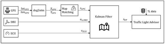 This research paper introduces a localization technique that is both simple and reliable, offering robustness and accuracy for a TLA application. The approach relies on the use of a Kalman filter and map matching. The filter incorporates a one-dimensional uniformly accelerated kinematic motion model and integrates data from various onboard sensors, including the IMU, GPS, and Electronic Control Unit (ECU), each operating at different frequencies. Moreover, the localization algorithm is integrated into the Traffic Light Advisor (TLA) system, as developed in [6]. This integration optimizes the vehicle’s speed, minimizing unnecessary stops and ensuring a smoother driving experience, ultimately reducing energy consumption.
