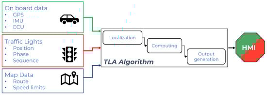 Figure 7 represents the scheme of the Traffic Light Advisor system: the inputs, coming from onboard sensors for the localization algorithm presented in Section 4; the traffic lights; and the map enter the algorithm that produces an output that is shown in the HMI.