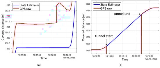 The first two items are analyzed in Testing Area 1 (i.e., Figure 4a) which covers the regular service path of the vehicle. Figure 8a depicts the trend of the covered distance (i.e., the curvilinear coordinate along the path) in correspondence to a stop. As can be seen, on the one hand, the GPS trend is floating; on the other hand, the state estimator is able to provide a constant s value thanks to the increase in the . This allows having a constant value for the curvilinear coordinate when the vehicle is stopped, which is fundamental for the TLA application as the change in the distance of the traffic light ahead affects the TLA speed calculation. The plot reported in Figure 8b shows the state estimator trend during a prolonged GPS outage because of a 200 m long tunnel. The distance between the state estimator value and the GPS coordinate as soon as it becomes available is equal to 1.86 m. Although this value is relatively high, the GPS benchmark after a long outage has to be considered as not reliable, as it requires some time (i.e., 20–30 m) to obtain acceptable GPS accuracy.