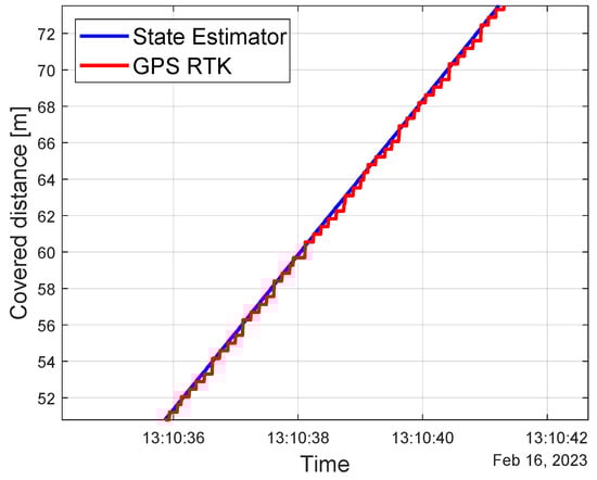 In Figure 9, a portion of the trend of the covered distance on the closed path of the Testing Area 2 is shown. In this scenario, it is possible to appreciate a much smoother trend of the state estimator with respect to the step-wise GPS signal because of the higher frequency of the localization algorithm, i.e., 100 Hz. When considering the entire path, the estimation error can be calculated as