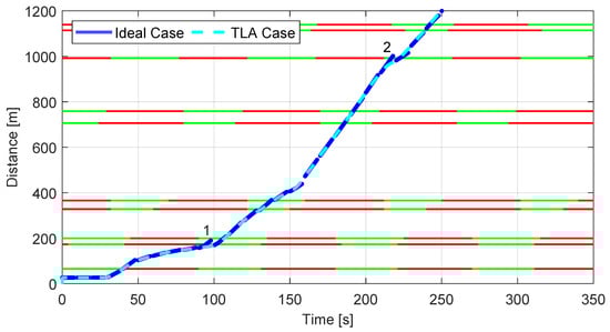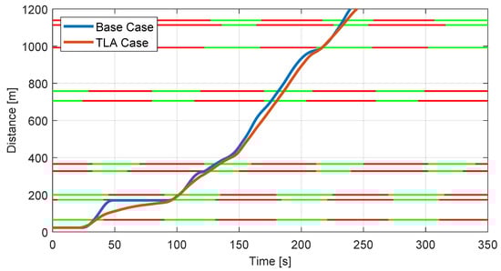 As mentioned in Section 5, the assessment of the TLA performances is performed both from a kinematic and an energetic point of view. In particular, in Figure 11, the plot of the covered distance of one test run, comparing the Base Case of the driver with the TLA Case, is shown. The horizontal lines represent the traffic lights status on the path, with the sequence between the red and green phases. It is worth mentioning that the yellow phase has been included in the red one for adding an extra safety margin to the algorithm.