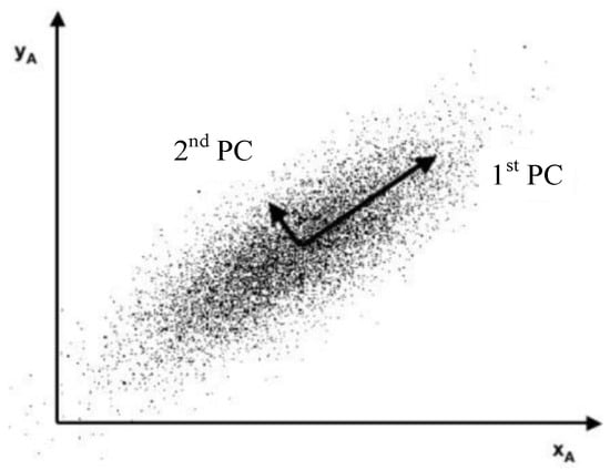 The PCA method was commonly used for reducing data dimension and noise []. Since the fundamental process of PCA is to calculate the orthorhombic directions in which the random data have obvious variances [], as shown in Figure 2, this method is considered to have the potential to indicate the temperature gradient caused by defects.