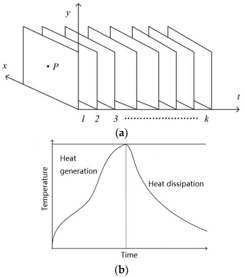 (a) Schematic of thermal image sequence, (b) temperature variation curve of pixel P.