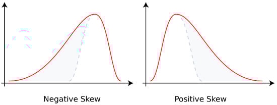 As shown in Figure 4, the skewness is greater than zero when the data are located to the right of the mean, i.e., negative skewness; less than zero when the data are concentrated on the left side, called positive skewness. When the data are in the normal distribution, the skewness is 0 []. The skewness is the ratio of third-order center distance to variance. The formula is as follows [].